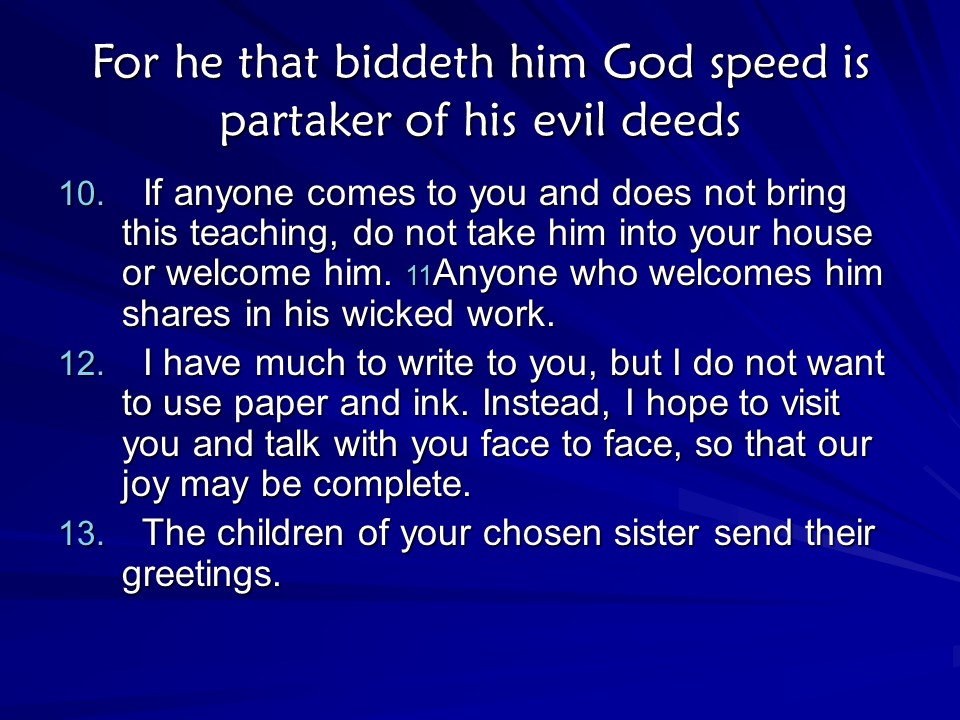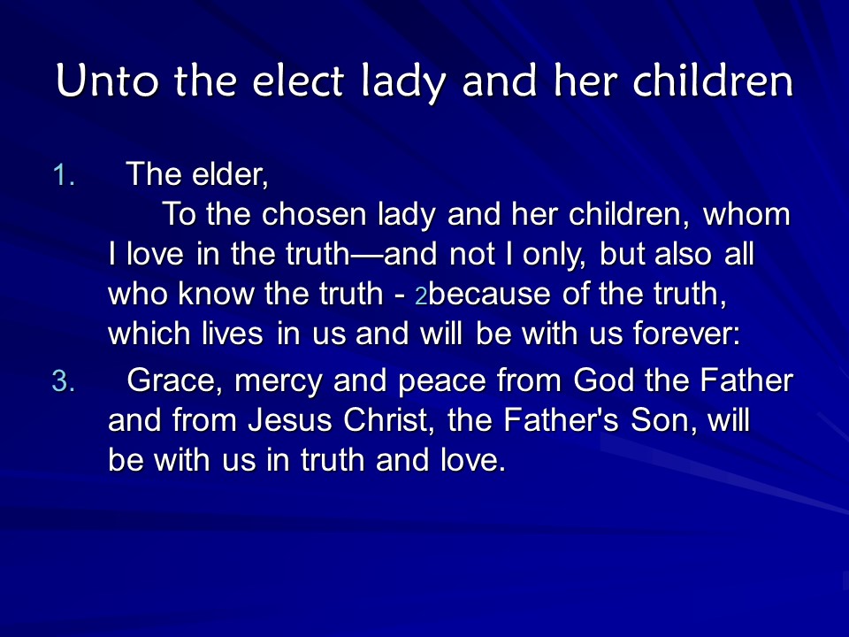 2 John is a very short letter, greeting the elect lady with joy that she and some of her children walk in Christ’s commandments, but also warning her to beware of Antichrist deceivers.