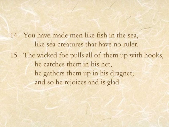 Habakkuk 2. The LORD answered the prophet to his second complaint. It contains this gem, just as valid today as it was then: “The just shall live by his faith“. On the other hand there was promised more woe to the wicked.