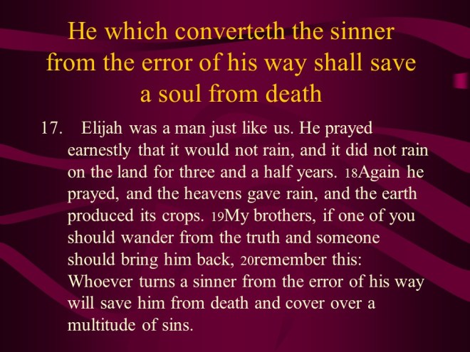 James 5 begins with a stern warning to rich oppressors, much like Old Testament teaching, but this letter is to the Jews in dispersia. He tells them to be patient, persevere, meet each other’s need and above all do not swear, but let their yes be yes and their no be no. If anyone is sick, call in the elders and pray for him. ” The effectual fervent prayer of a righteous man availeth much.” Bring Back erring Brothers. “Let him know, that he which converteth the sinner from the error of his way shall save a soul from death, and shall hide a multitude of sins.”