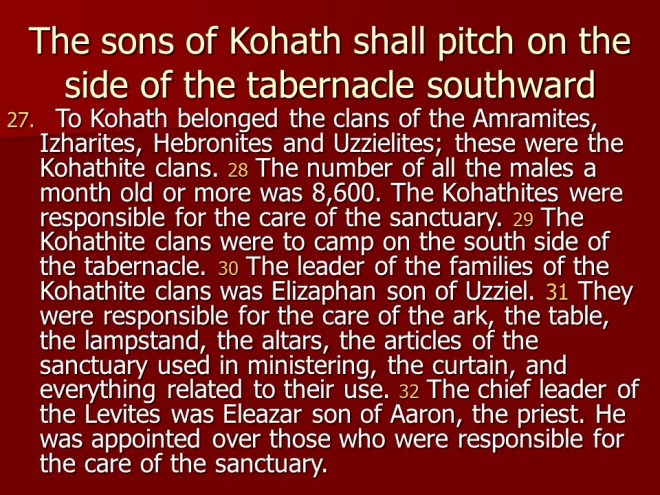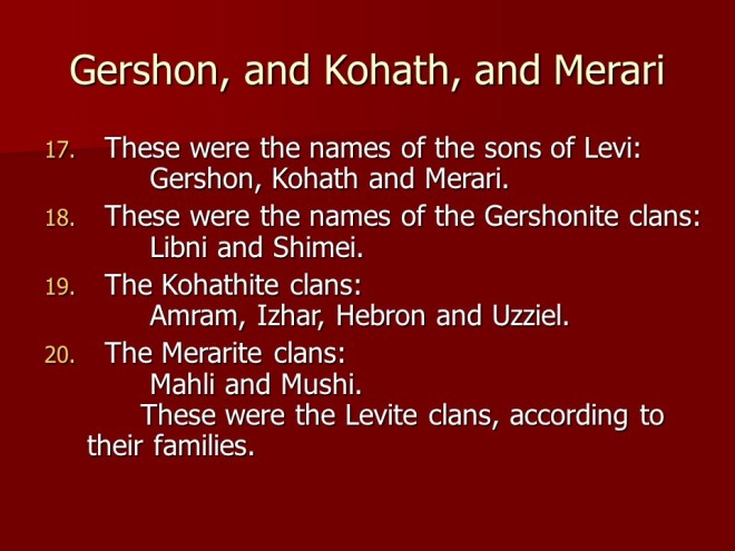Numbers 4, the Sons of Korath, the Sons of Gershon, the Sons of Merari, Census of the Levites. Numbers 4, the Sons of Korath, the Sons of Gershon, the Sons of Merari, Census of the Levites.