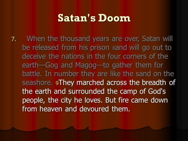 Revelation 20, Satan Bound 1,000 Years, The Saints Reign with Christ 1,000 Years, Satanic Rebellion Crushed, The Great White Throne Judgment. Revelation 20, Satan Bound 1,000 Years, The Saints Reign with Christ 1,000 Years, Satanic Rebellion Crushed, The Great White Throne Judgment.