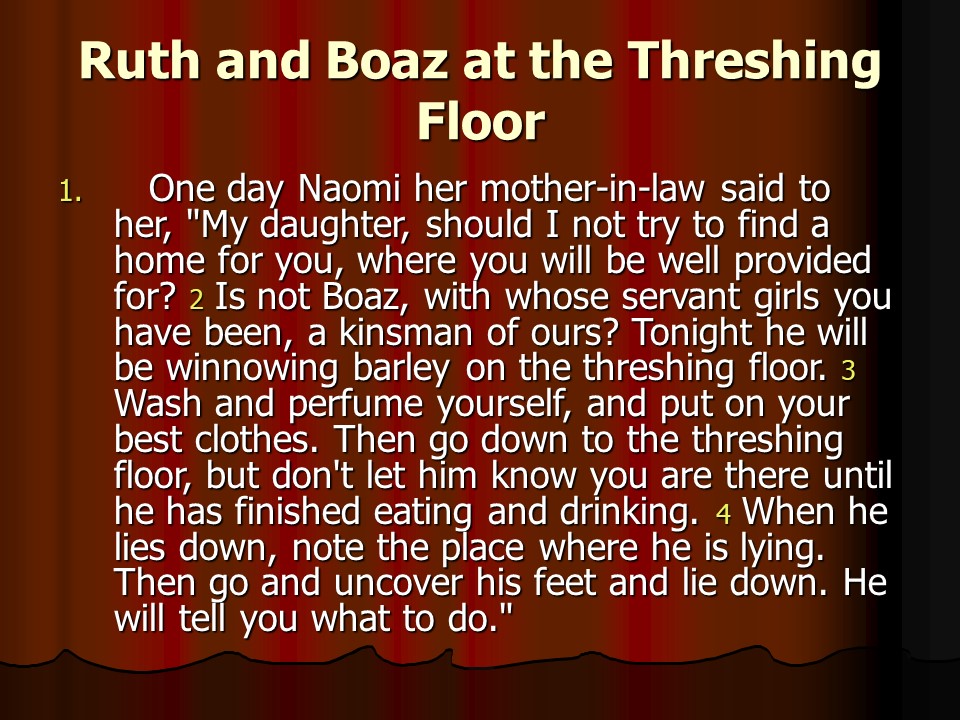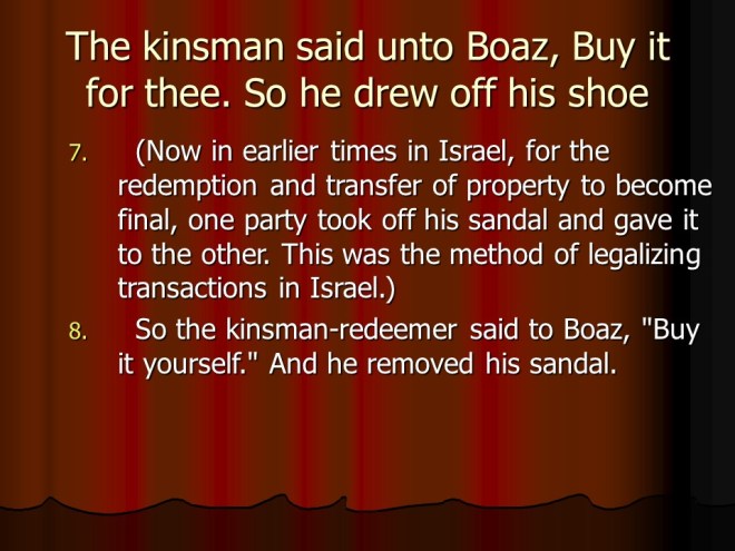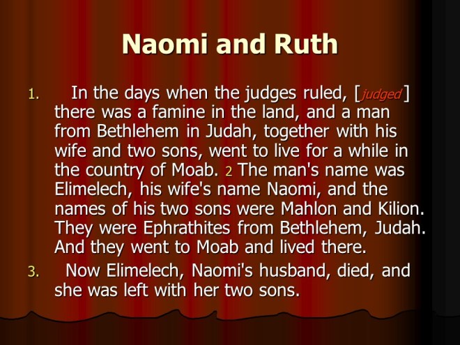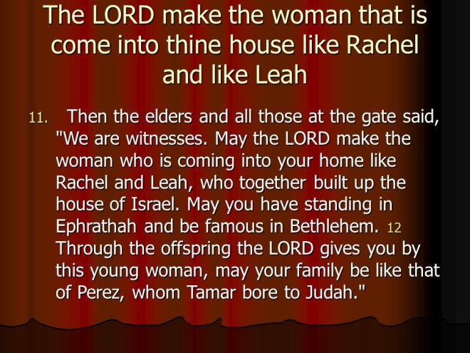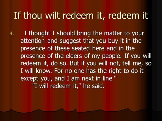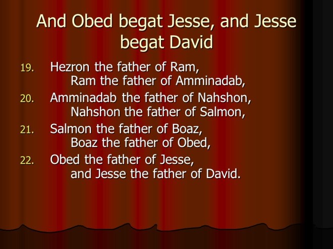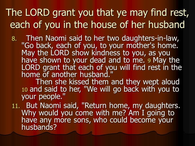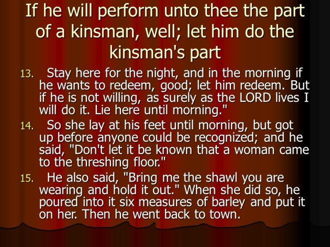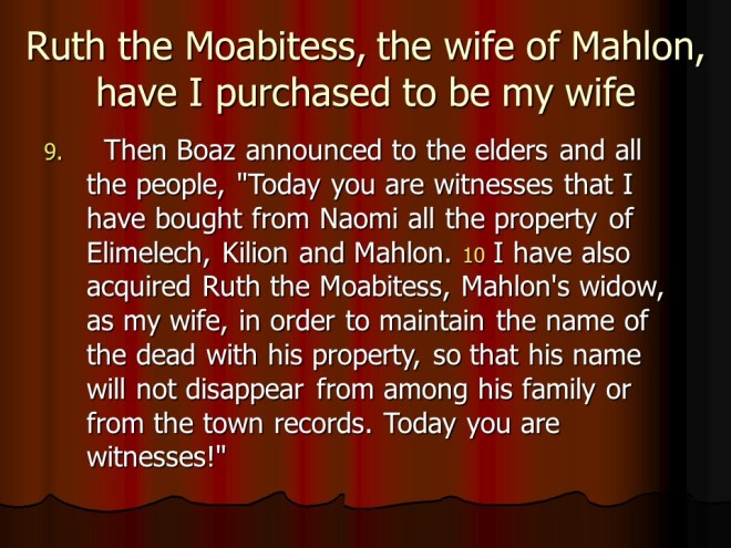 Ruth 4, Boaz redeemed Ruth, and that’s how Ruth came to be in the genealogy of David and Jesus.