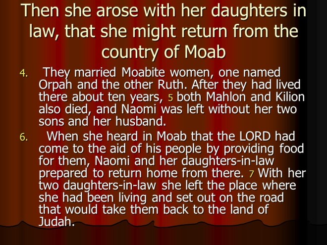 Ruth 1.Elimelech’s family went to Moab, and all men die. Naomi returned back to Israel with Ruth, a Moabite. The famous quote from Ruth 1: “Intreat me not to leave thee, or to return from following after thee: for whither thou goest, I will go; and where thou lodgest, I will lodge: thy people shall be my people, and thy God my God:”