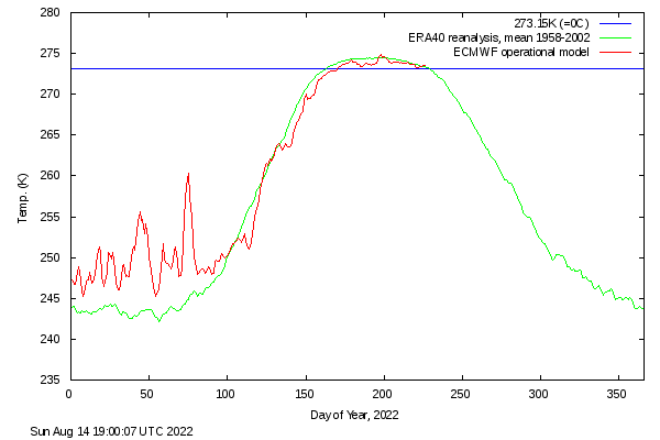 Even more illustrative is the development of ice on Greenland. In 2012 it looked like all of Greenland was going to melt in less than 1000 years, and the polar ice cap would be gone altogether in late summer of 2020. The ice over Greenland is now growing ever so slightly again: