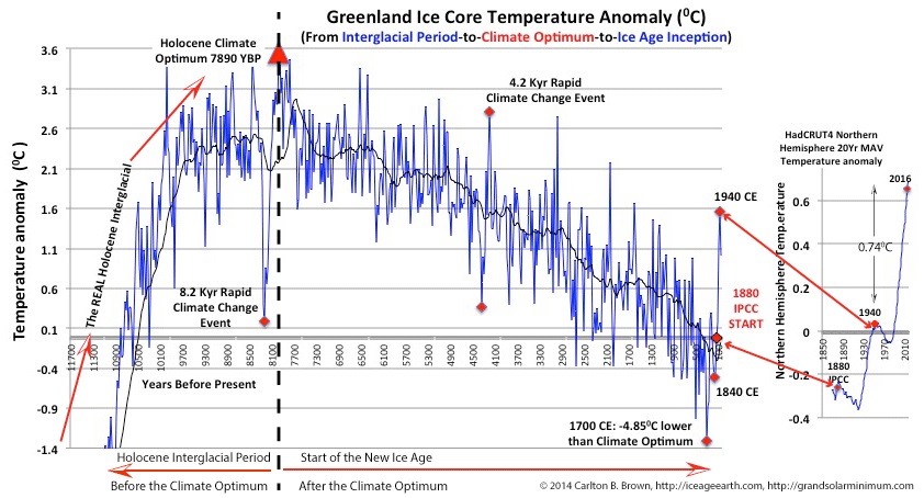 We are near the end of the interglacial period, and from now on we will slowly enter a new ice age at a rate of – 1C per 2000 years.This means we are cooling down another 0.0135C by 2050