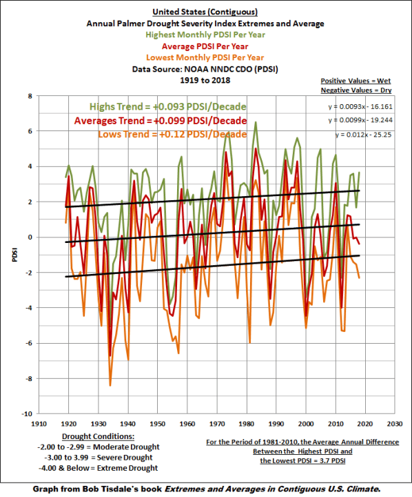 The Palmer Drought Severity Index (PDSI) uses readily available temperature and precipitation data to estimate relative dryness. It is a standardized index that generally spans -10 (dry) to +10 (wet). The chart shows Continental U.S. is getting wetter, about 0.01 PDSI index per year with the lows trend is getting wetter the fastest. This is good news.