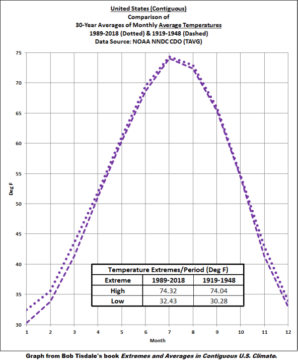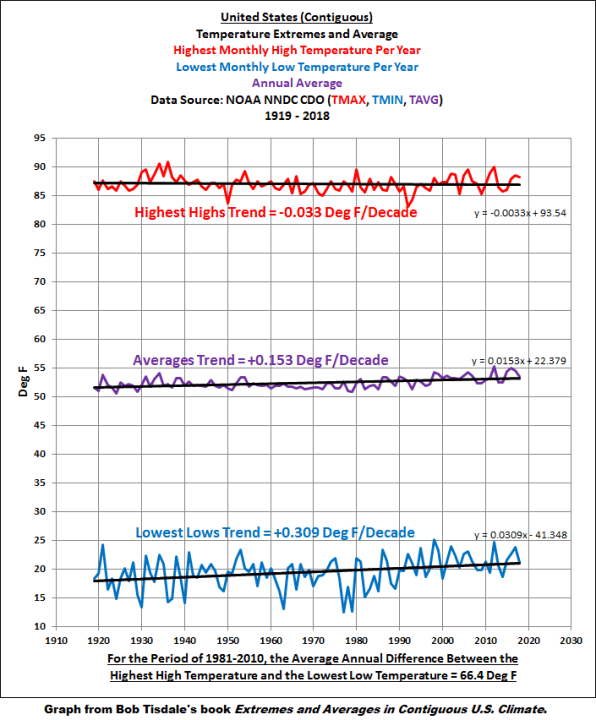 The temperature extremes keep narrowing, the maximum temperatures decrease by 0.033 degree F/decade, but the minimum temperatures increase by 0.309 degree F/decade. This is good, since tornadoes are a result of extreme temperature differences, most often associated with cold fronts.