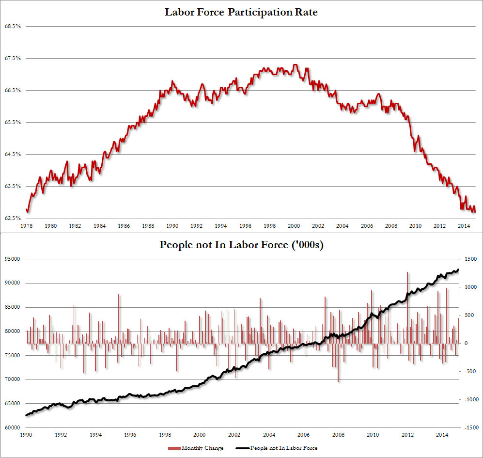 Americans not in the labor forced soared by 451,000 in December, far outpacing the 111,000 jobs added according to the Household Survey, and is the primary reason why the number of uenmployed Americans dropped by 383,000.
