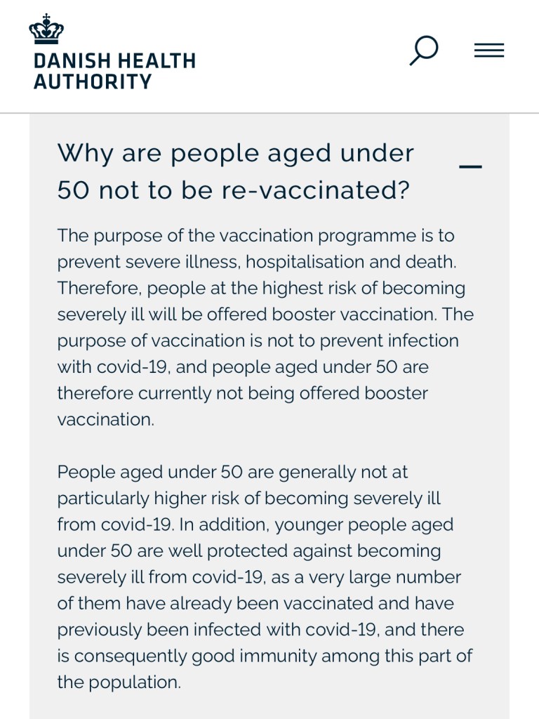 Denmark ends COVID-19 vaccine and booster shots for people under 50 except for high risk people as determined by their doctors.