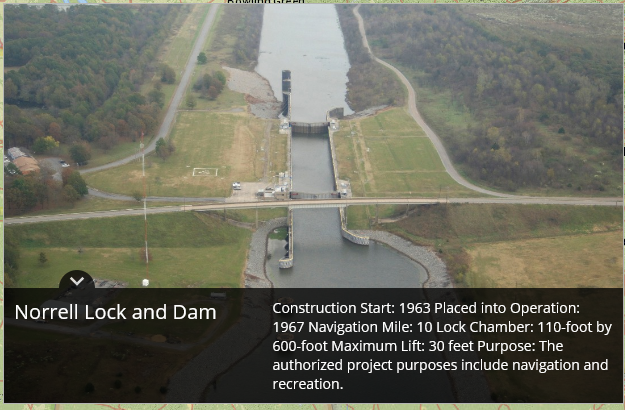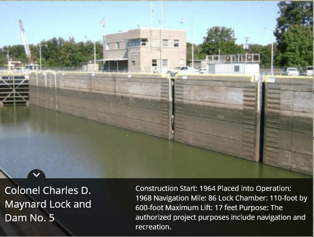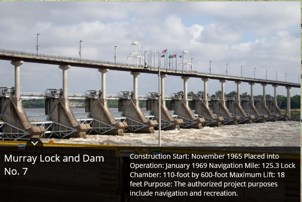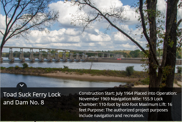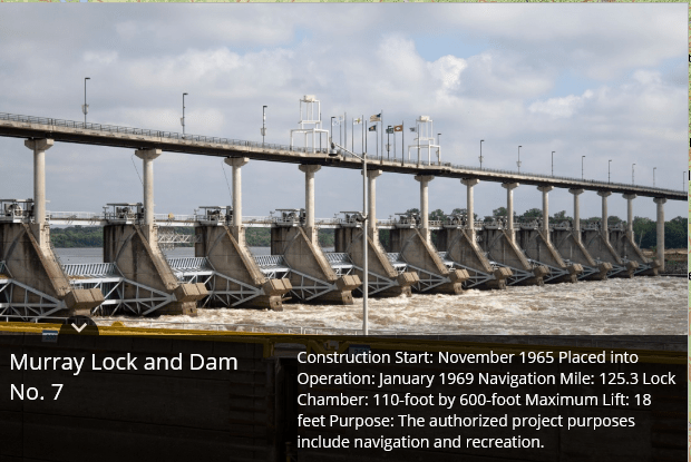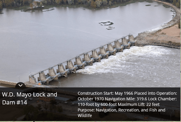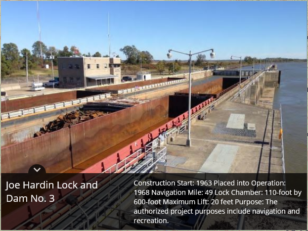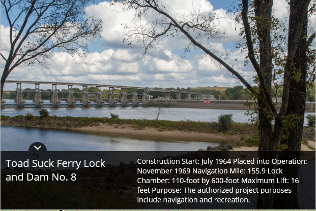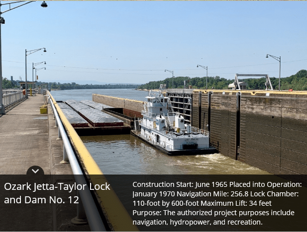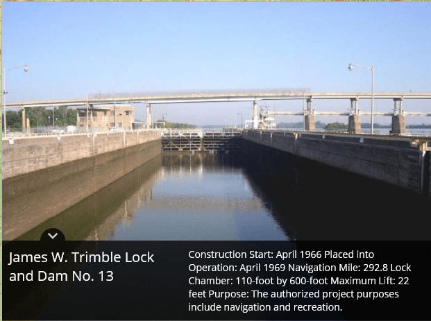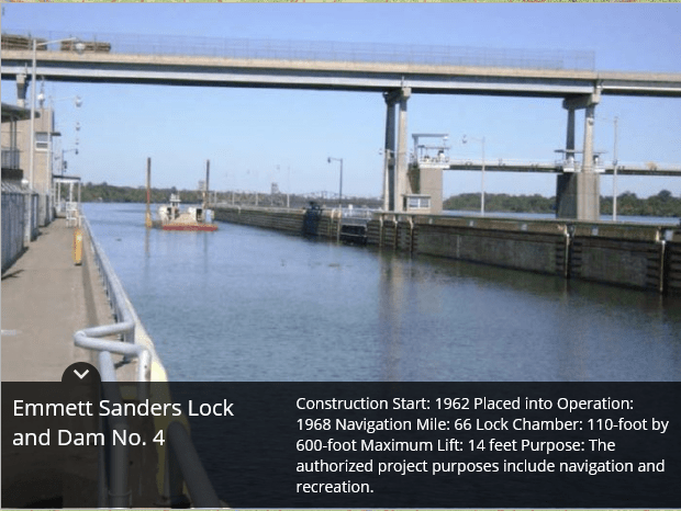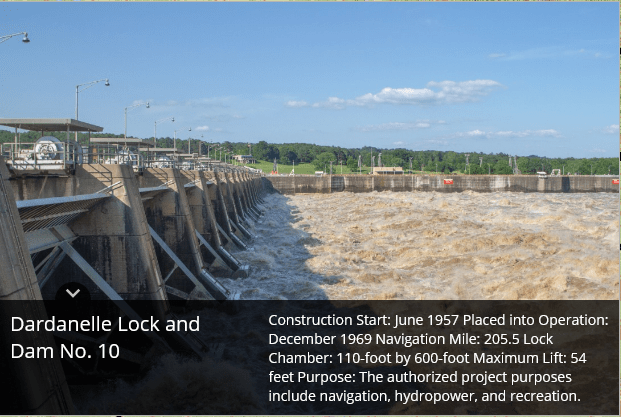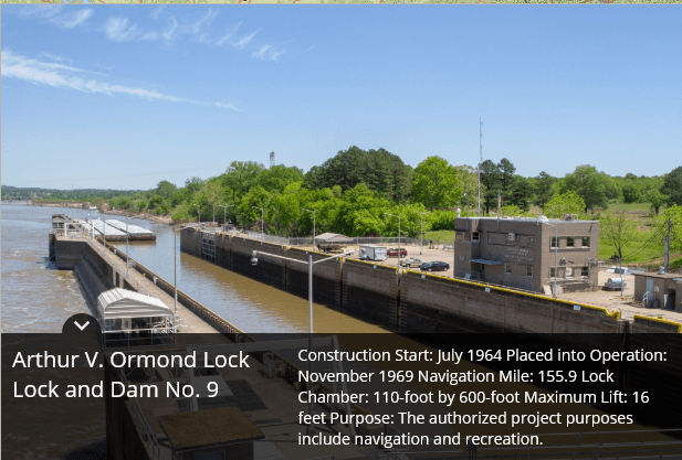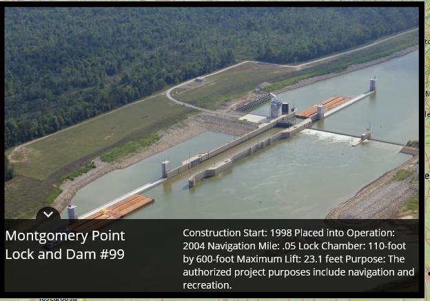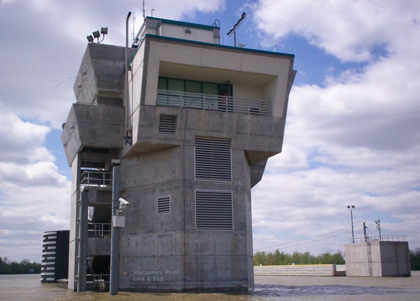 Montgomery Point Lock and Dam features “first of its kind” hydraulically operated gates. When the tail water is at elevation 115′ and rising, the dam gates are flat on the bottom of the river and barge traffic passes over the gates in the navigation pass spillway to minimize lockages saving time and money.This lock is frequently submerged. Only the top of the control tower remains above water