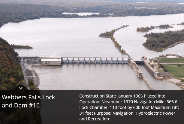 Leg 1 of The Trans-Rocky-Mountain aqueduct. From the Mississippi river to Webbers Falls lock and dam. Total length 15miles of aqueduct and 335 miles of river. Cost of water 333 kWh per acre-ft.