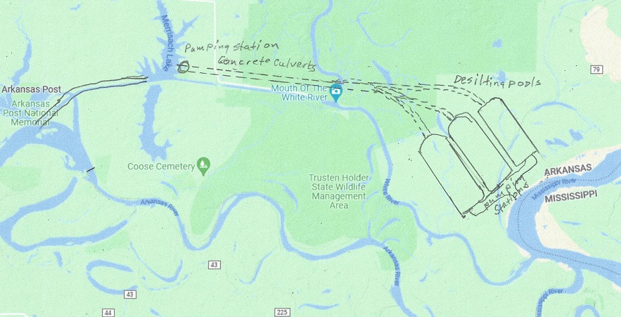 The Mississippi river is muddy. When water is pumped up there needs to be a number of de-silting pools, where the silt is returned to the Mississippi river. Here is suggested 3 pools, each capable of de-silting 10,000 cfs of water, one for the Trans-Rocky Mountain aqueduct, and two for the Trans-Continental aqueduct, being built as the whole aqueduct is nearing completion. The top of the pools is set at 150 ft elevation. Should the Missisippi River flood higher than 142 feet the operation will be shut down until elevation is below 142 feet again, and Lock 2, the Norrell Lock and dam is operational again. For the Trans-Rocky_Mountain aqueduct up to 10,000 cfs needs to be pumped up between 20 and 62 feet, for an energy consumption of between 1MW and 56 MW. The map below show one possible location for the pools: