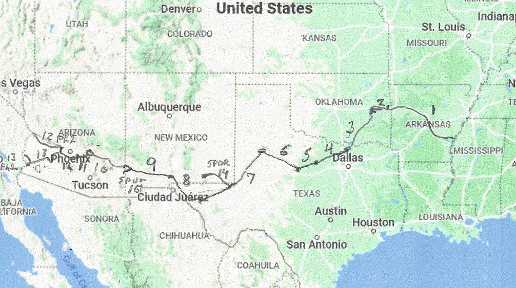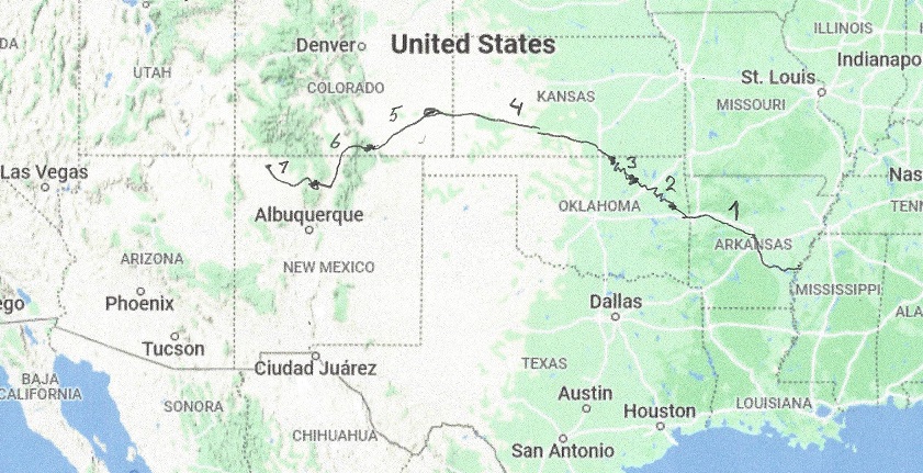 The Trans-Rocky-Mountain aqueduct starts out at the Mississippi river, and for the first leg follows the Arkansas River from Mississippi River to Lock16 of the Arkansas River, a distance of 366 miles.