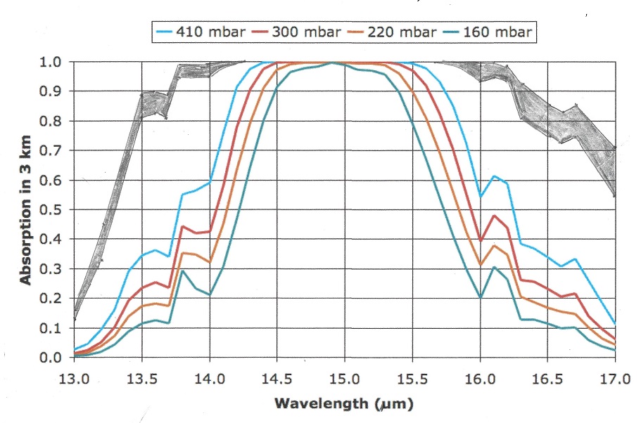 Let us now take a look at the Carbon Dioxide bands of absorption, at 2.7, 4.3 and 15 microns. Of them the 2.7 and 4.3 micron bands absorb where there is little black body radiation, the only band that counts is at 15 microns, and that is in a band where the black body radiation has its maximum. However it is also in a band where water vapor also absorb, not as much as CO2,only about 20% to 70% as much. The important thing is that in the frequency band of 14.5 to 15.5 micron CO2 absorbs all the energy available in that spectral range, and it also did it before industrialization when CO2 levels were one third less than today!