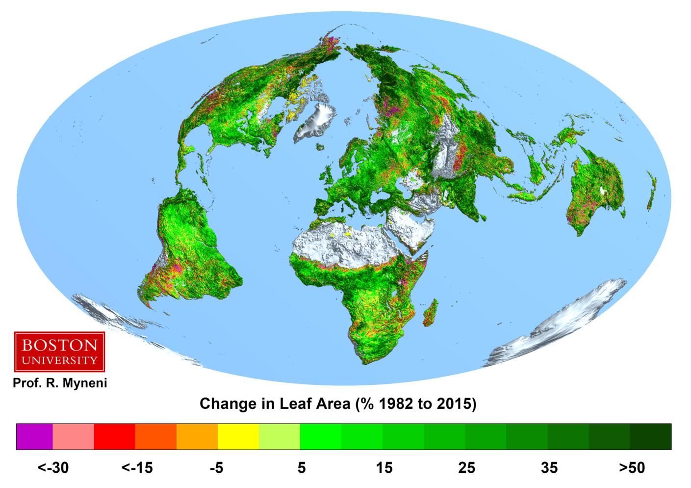 Most of the earth displays an increase of leaf area, but there are areas in red that are becoming less green. The areas are: The American Southwest, The Pampas area of South America, a 100 mile band in Southern Sahara, part of East Africa, Madagascar, South East Africa, Western Australia, Part of the Volga region, Kazakhstan east of Lake Aral and various parts of China, and the Mekong river. These areas have this in common, the aquifers ate being depleted, the rivers are diminishing and some of them no longer reach the ocean, lakes are almost disappearing, but people still move to those areas “for the good climate”.