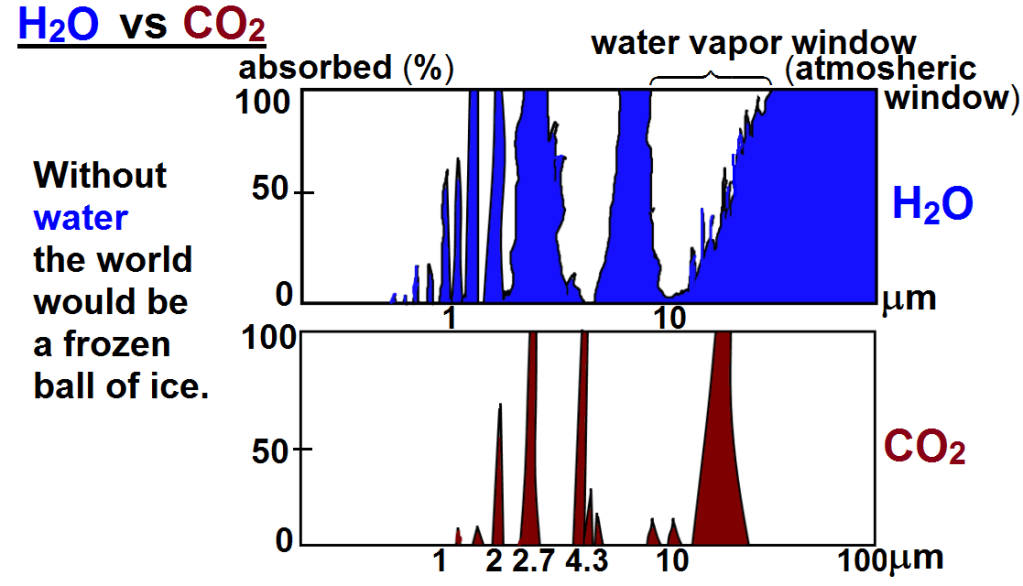 The following chart shows both CO2 and H2O are absorbing greenhouse gases, with H20 being the stronger greenhouse gas, absorbing over a much wider spectrum, and they overlap for the most part. But it also matters in what frequency range s they absorb.