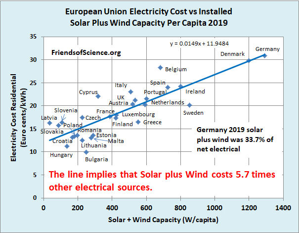 These simple calculations show that any claim that Wind and Solar power are now cost competitive with conventional fossil fuel (Gas-fired) generation are patently false. The figures give an outline of the financial achievements of Green activists in stopping fracking for gas in Europe, close on to $1.2 trillion of excess costs.It would be better not to import any solar panels and wind power generators from China and let them pay for the extra cost rather than building more coal burning plants. After all they were planning to build over a thousand new plants between now and 2030, all legal under the Paris accord. This would benefit the world climate much more, since Chinese coal plants are far more polluting, since China has far less stringent environmental regulations than U.S.U.S. uses 13.5% of the world’s coal, and eliminating U.S. CO2 emissions would in time reduce the world temperature by 0.023C, providing no other country, such as China or India would increase their use of Coal, which they are, to the total of 1300 new coal plants between now and 2030. This would raise global temperature by more than 0.06 C.