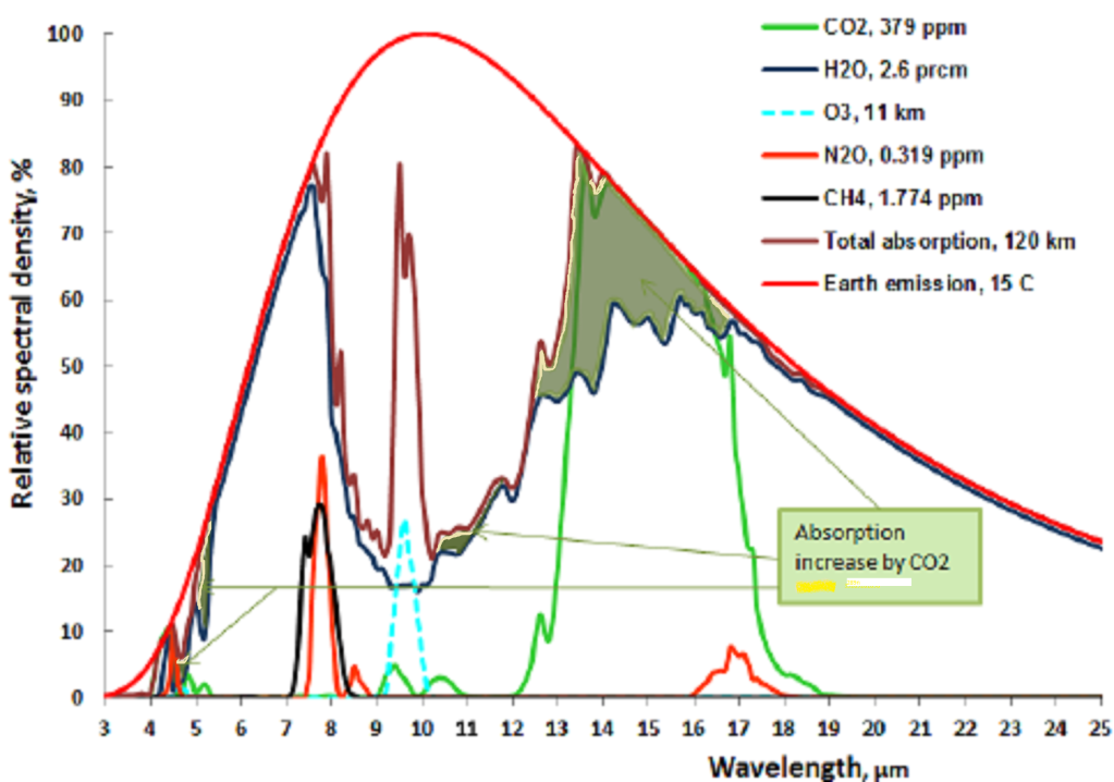 The incoming solar radiation includes ultraviolet radiation, visible light and near infrared radiation. This is all the heat incoming to the earth, except what is conducted from the earth’s core. All area under the curves of the right half represent greenhouse gases absorption, except the blue area which represents energy radiated into space. The all dominant green-house gas is water vapor but CO2 contributes with 2 absorption bands, at 4.3 microns, 9.4, 10,4 and 14.9 microns. The 4.3 micron absorption is of almost no importance since it occurs at a wavelength where very little radiation is available, neither from the sun, nor from the earth’s black body radiation.