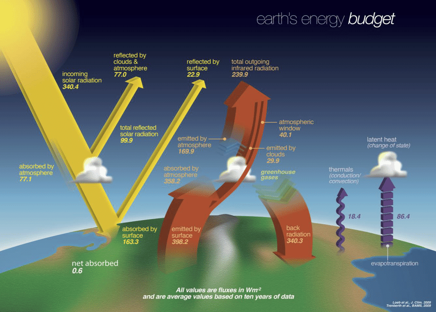 The first thing to notice is that no absorption exceeds 100% , so at 14.9 micron wavelength CO2 absorbed 100%, and water vapor absorbed another 80%, the total sum is still 100%. It is impossible to absorb more than 100% of the total energy available for that wavelength. Therefore between the wavelengths 14 and 16 microns all energy was absorbed regardless of CO2 concentration and water vapor concentration. The olive area represents the extra absorption of CO2 at 280 ppm when the water vapor is taken out (you cannot absorb more than 100%). The small yellow slivers represent the extra CO2 absorption at 560 ppm. The white area between the brown total absorption area and the red earth emission line is the total emitted energy through the atmospheric window. Methane and N2O gas greenhouse absorption occur at wavelengths where water vapor already absorbs nearly 100%, so their contribution to greenhouse gases is negligible. Likewise Ozone absorption occurs where O2 also absorbs. From the picture below (thanks, NASA) we can see that the total amount of energy escaping through the atmospheric window from clouds and from the ground is on average (29.9 + 40.1) = 70 W/m2. In pre-industrial times the value would have been around 70.7 w/m2.
