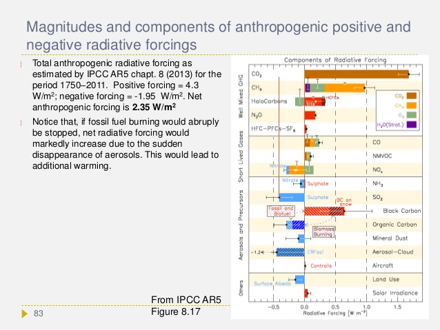 This is the official IPCC AR5 assessment of forcing factors, and we can see that CO2 is over-estimated by a factor of 2.5 and Methane by a factor of 10. When this is taken into account the net forcing from all other factors is neutral within the margin of uncertainty.