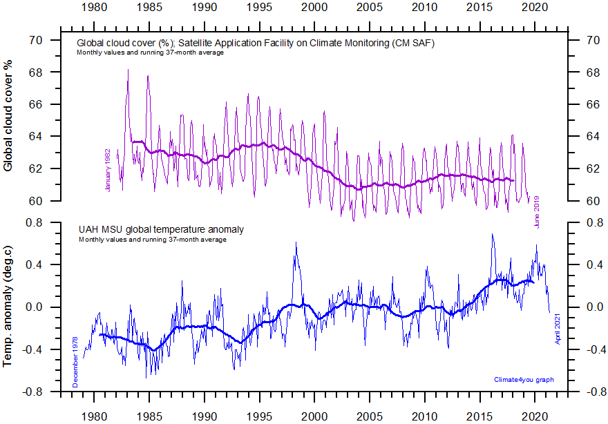 In 1984 the average cloud cover was 63.7%, in 2019 it was 61.1%, a loss of 2.6%. The total reflection from clouds and atmospheric scattering is 77 W/m2, of which 60 is from cloud reflection. A 2.6% loss of area of reflection leads to a decreasing of incoming energy of 60 * 0.026 = 1.56 W/m2. This results in a temperature increase to 287 * fourth root of (1- (1.56 / 340)) = 287.33 K, or 0.67 degree Celsius.