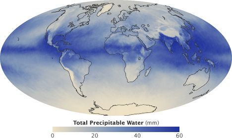 This is a world map showing the average cloud cover in August 2009. It shows the cloud free areas of the earth in blue. Another way to look at it is to see how much total water vapor there is in the atmosphere: