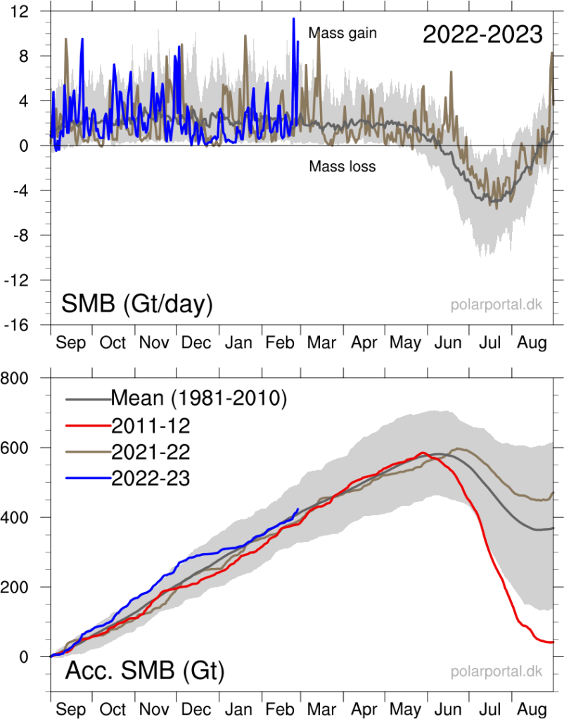 Even more illustrative is the development of ice on Greenland. In 2012 it looked like all of Greenland was going to melt in less than 1000 years, and the polar ice cap would be gone altogether in late summer of 2020. The ice over Greenland is now growing ever so slightly again: