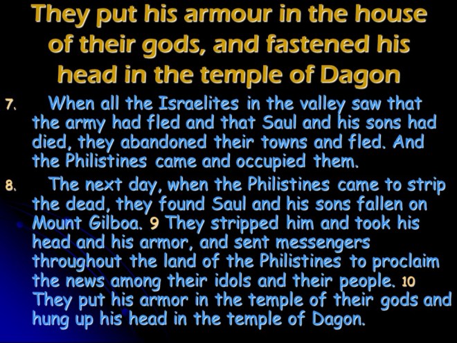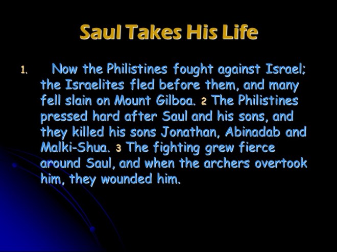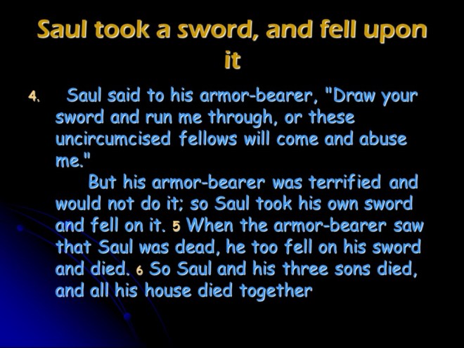 1 Chronicles 10 tells the inglorious death of king Saul. He fell on his own sword and his sons were killed.