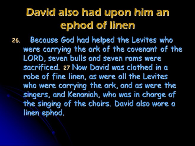 1 Chronicles 15. The Ark was brought to Jerusalem in a great procession with music and dancing. When David’s wife Michal, daughter of Saul saw David dancing in the street at the joyous occasion, she despised him.