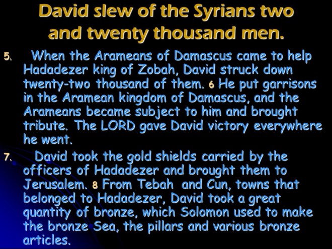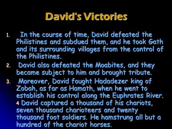 1 Chronicles 19. Wars continued, the Ammonites and the Syrians were defeated.