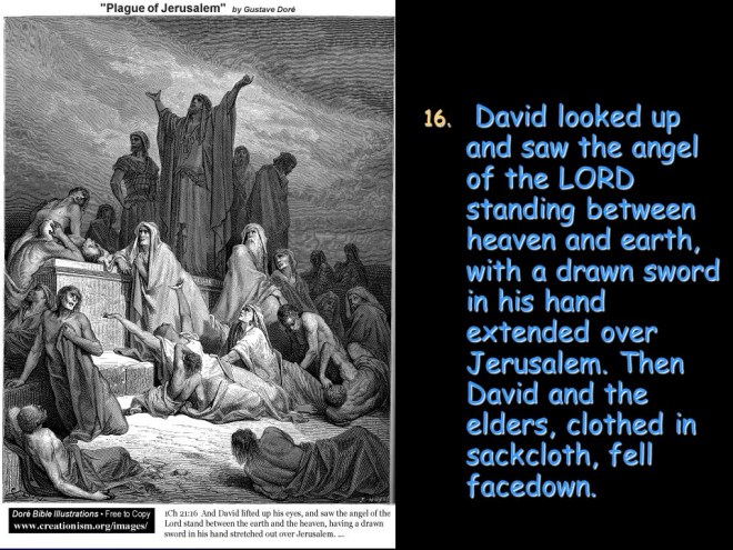 1 Chronicles 21. David took a census of Israel and Judah. This was a great sin and the LORD gave David three options how the country should be punished. David chose to be in the hands of the LORD, and the nation was punished by being visited by the angel of the LORD. The angel stopped at Araunah’s threshing floor, the future site of the Temple.
