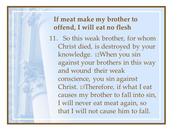 1 Corinthians 8, Paul gives practical advise: Don’t be a stumbling block to the weak.