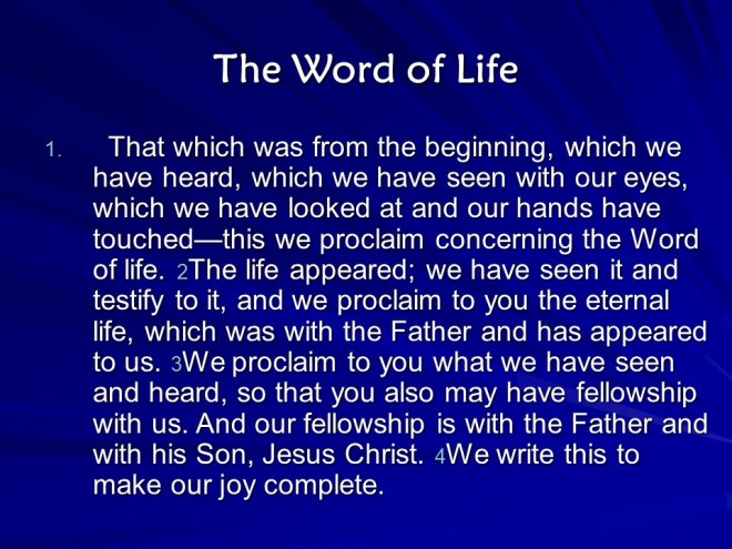 1 John 1. From the Beginning, what was heard, seen and touched we proclaim, that is the Word of Life. How can we have fellowship with God and with one Another? The Word of God through the Apostle John tells us how.