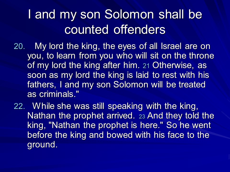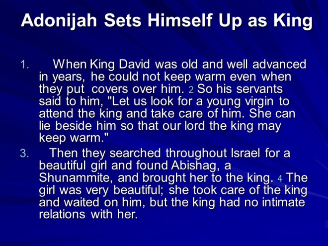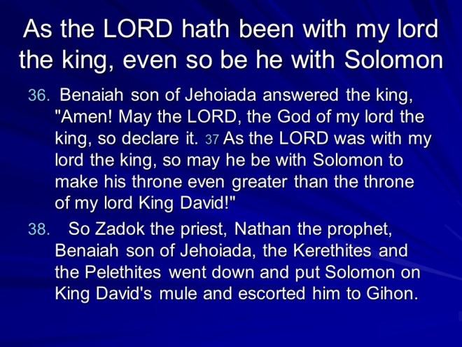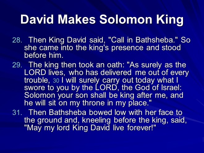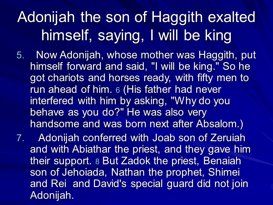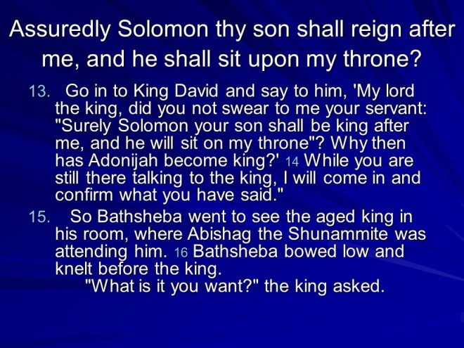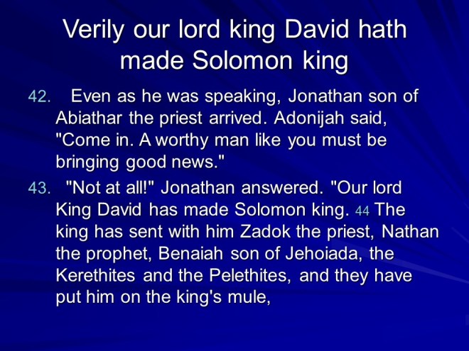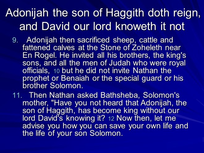 1 Kings 1. Adonijah, the heir apparent since his older brothers were all dead, set himself up as king before David’s death. David had Zadok the Priest and Nathan the Prophet proclaim Solomon King instead.