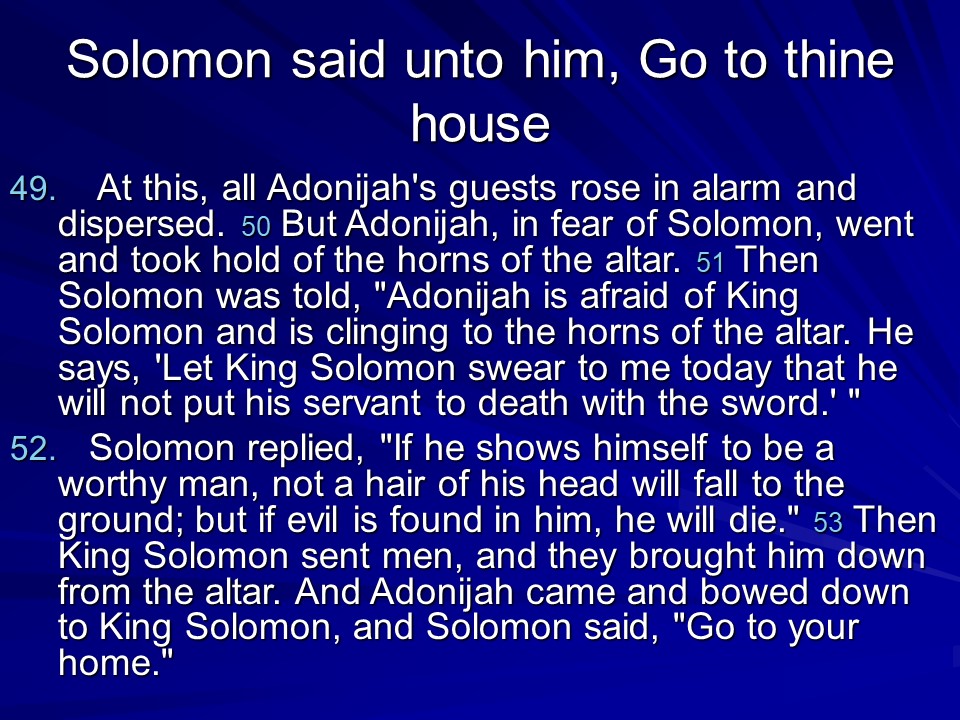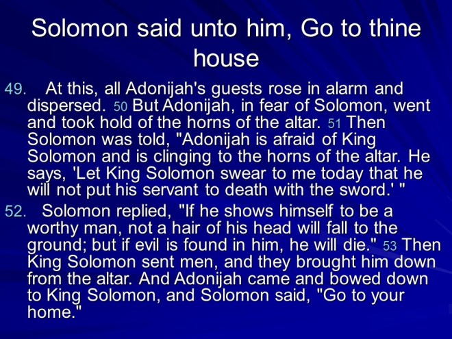 1 Kings 2. David gave his final instructions to Solomon, to which persons he should show kindness and to whom he should not, and then David died. Solomon had Adonijah executed exiled Abathar, executed Joab and Shimel, and showed kindness to the ones that had helped David. The kingdom was then firmly in Solomon’s hands.