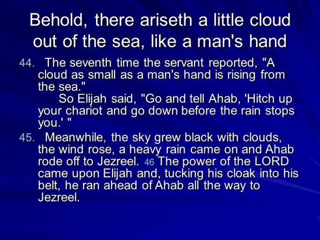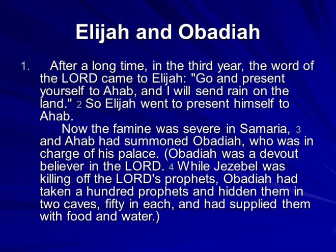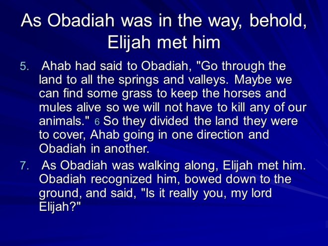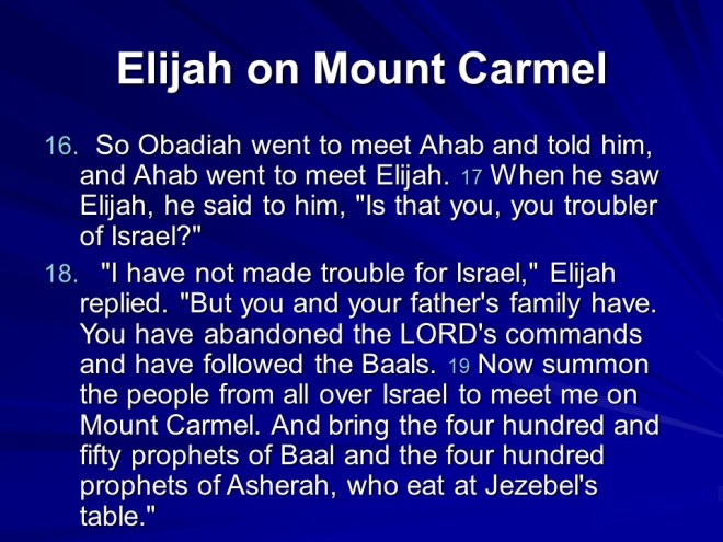 1 Kings 18. This chapter alone makes the reading of all of 1 Kings worthwhile. Elijah met Obadiah and sent a message to King Ahab. When they met, Elijah challenged Ahab to a competition: Four hundred fifty prophets of Baal and four hundred prophets of Asherah against Elijah alone on Mount Carmel to see whose God is victorious! You know the rest, enjoy reading!