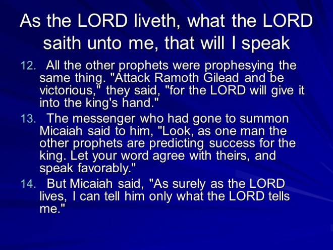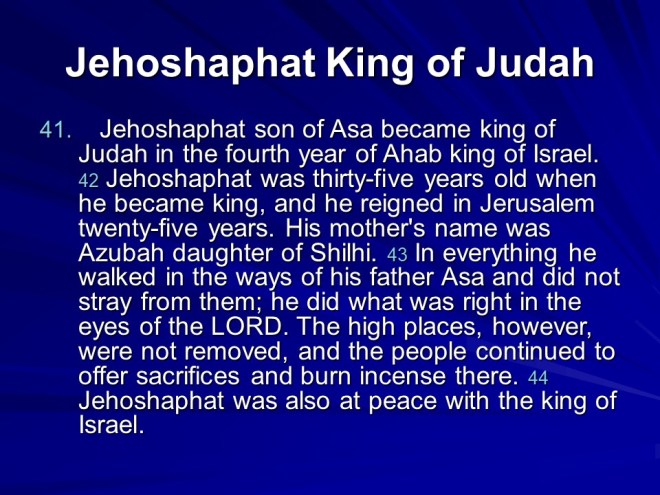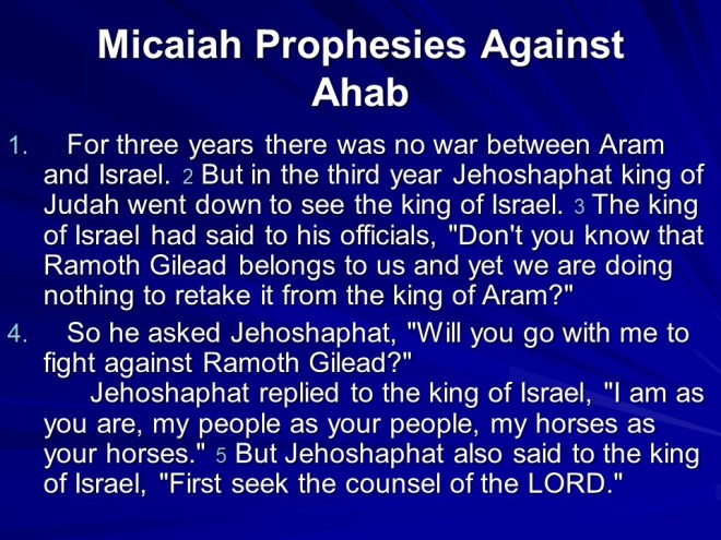 1 Kings 22. Micalah prophesied against Ahab, Ahab therefore disguised himself for protection but died in battle by a stray arrow. Jehoshaphat became King of Judah, followed by Ahaziah.
