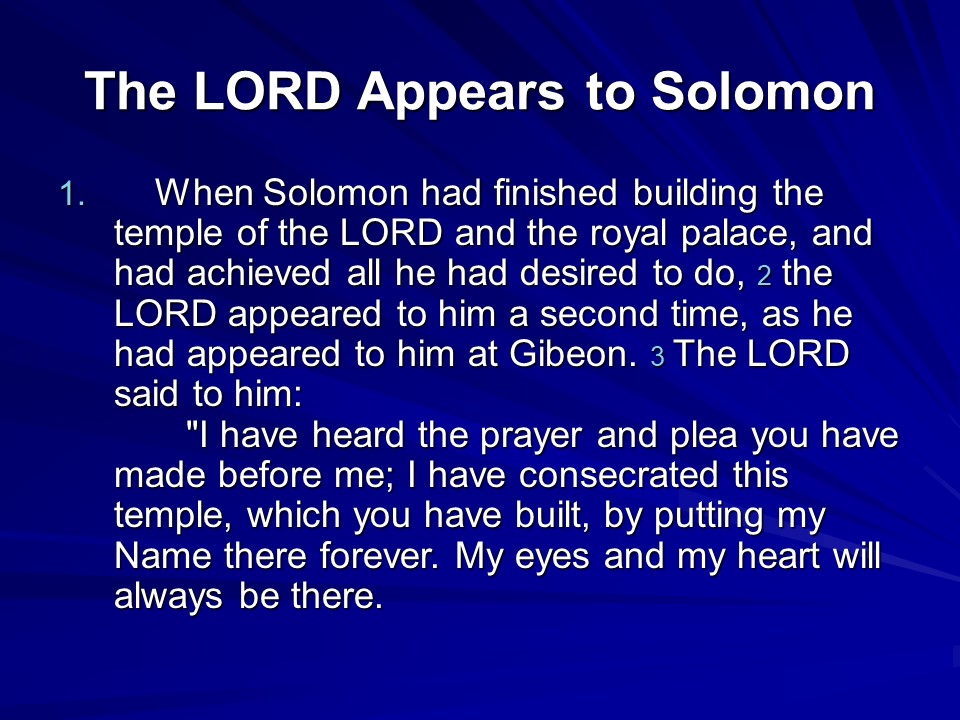 1 Kings 9 tells of God’s Second Appearance to Solomon, this time with a promise and a warning. Solomon and Hiram exchanged Gifts and it tells more of Solomon’s achievements.