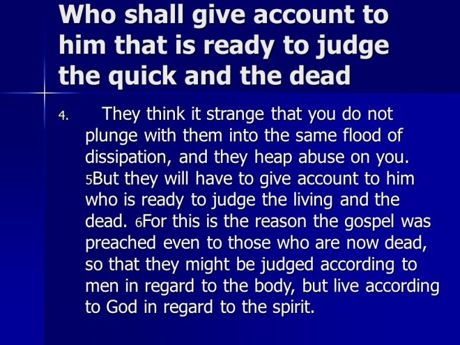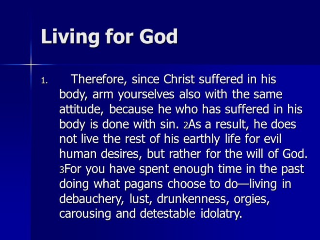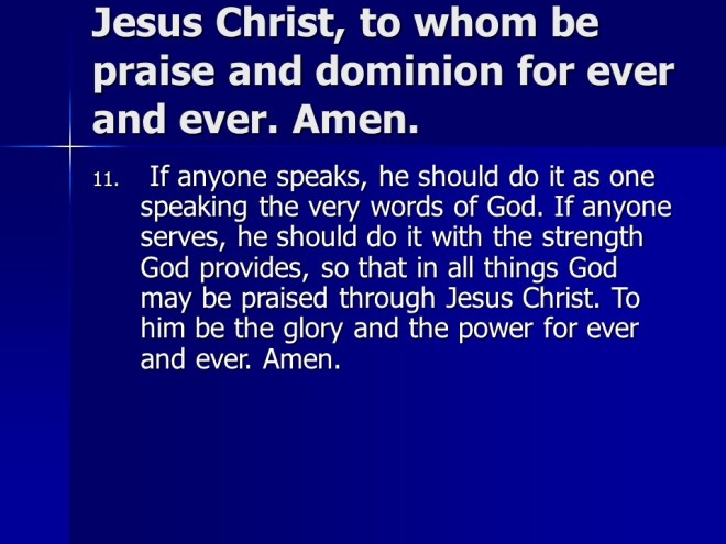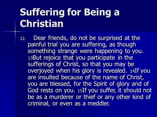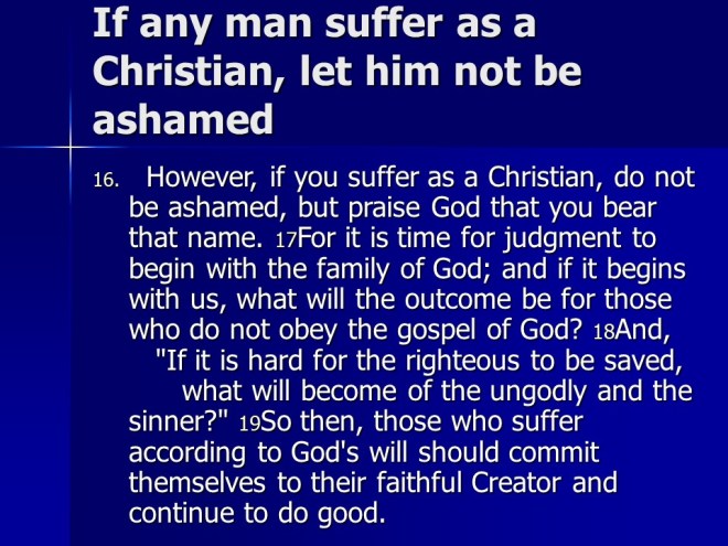 1 Peter 4. The apostle urged the believers to serve God as the end of all things is near. He told them to practice hospitality to the glory of Jesus Christ, and also not to be surprised when they suffer, remember it will be much worse for those who do not believe.