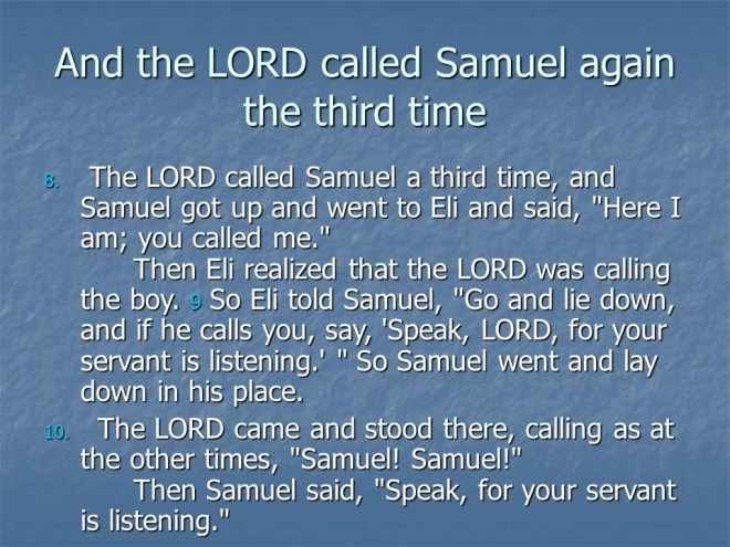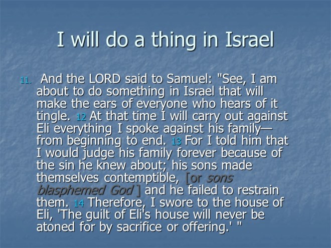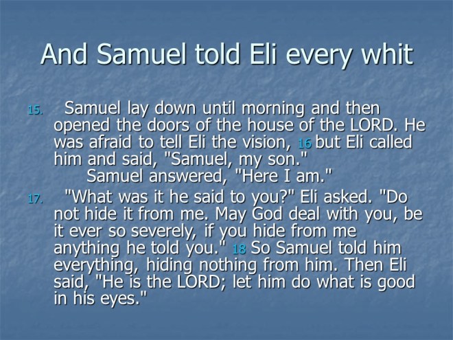 1 Samuel 3 tells of Samuel’s first prophecy, a prophesy against Eli and his sons, because Eli failed to restrain them.