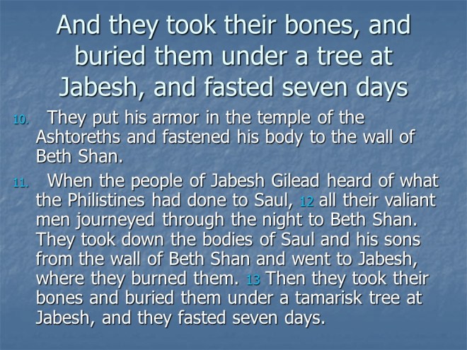 1 Samuel 31 tells of the death of Saul’s sons, and how Saul himself fell on his own sword.