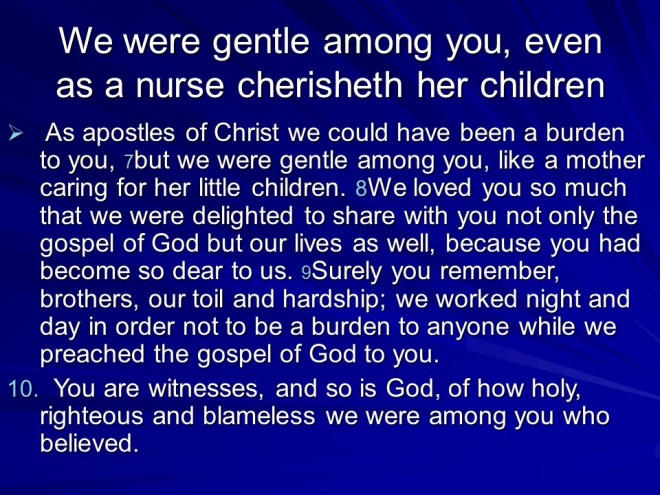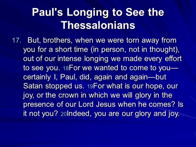 1 Thessalonians 2. The Apostle Paul defended his motives and his conduct, they were all pure. Then he gave thanks to God for the conversion of the Thessalonians and mentioned his longing to see them.