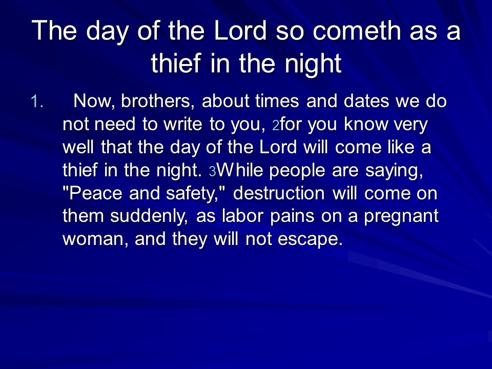 1 Thessalonians 5 speaks of the Day of the Lord; no one knows the day or time. Then the Apostle Paul gave final exhortations, among them are “Rejoice evermore. Pray without ceasing. In every thing give thanks: for this is the will of God in Christ Jesus concerning you.” (The last verse is my life verse).