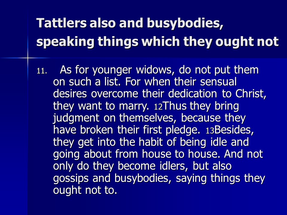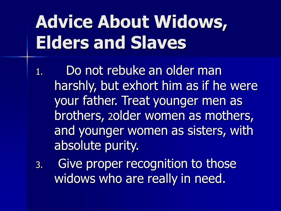 1 Timothy 5, Treatment of Church Members, Honor the Widows, Honor the Elders, A little Wine for thy stomach’s sake.