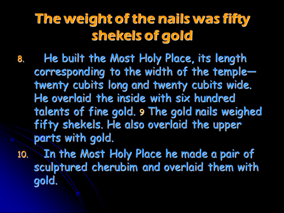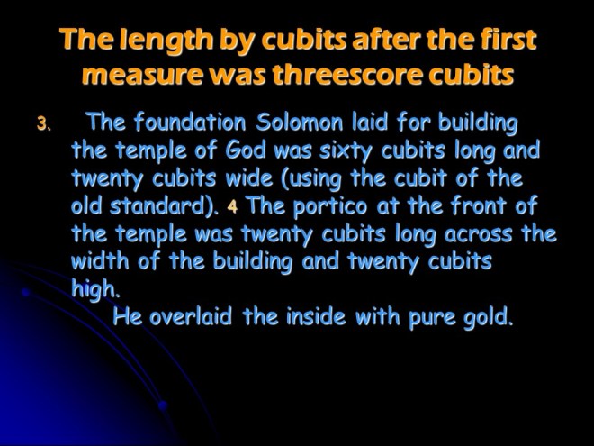 2 Chronicles 3. Solomon did build the temple to man’s standard, six hands to a cubit. He even used gold nails instead of iron nails in the ceiling, far more gold than was called for in the tabernacle.