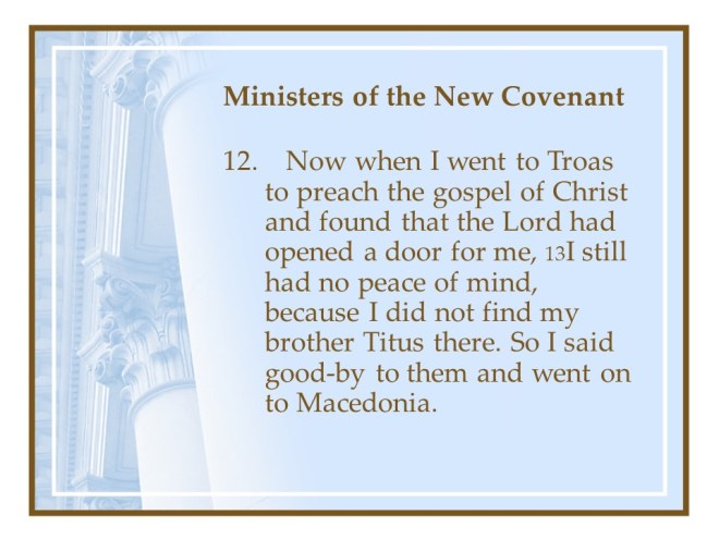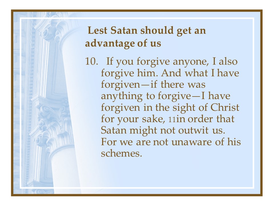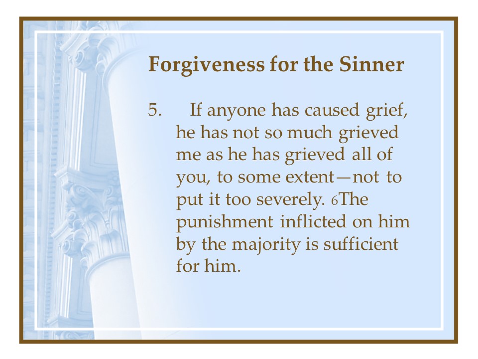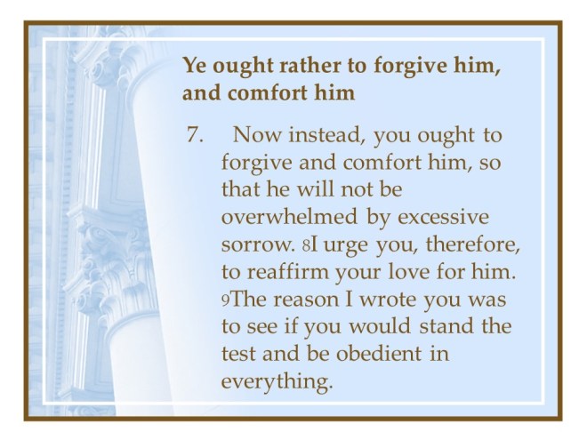2 Corinthians 2. The Apostle Paul sent a very loving and encouraging letter to the Corinthians. In it he emphasized they should be no more sorrowful, forgive the offender and triumph in Christ.