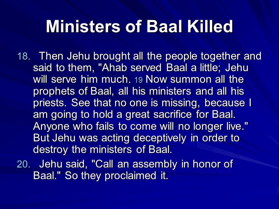 2 Kings 10, Ahab’s Seventy Sons Killed, Ahaziah’s Forty-Two Brothers Killed, The Rest of Ahab’s Family Killed, Worshipers of Baal Killed, Death of Jehu.