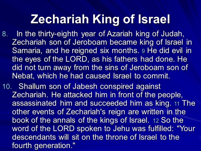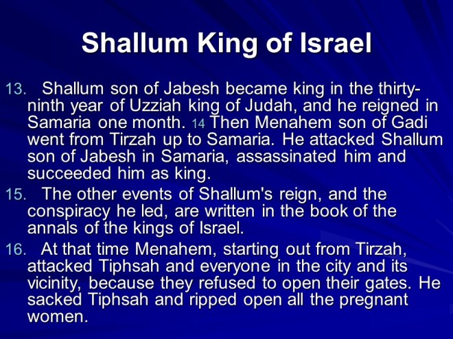 2 Kings 15. The parade of Kings of Israel and Judah continues.  Azariah reigned in Judah, Zachariah reigned in Israel, Shallum reigned in Israel, Menahem reigned in Israel, Pekahiah reigned in Israel, Pekah reigned in Israel, Jotham reigned in Judah, all in chronological order recorded.