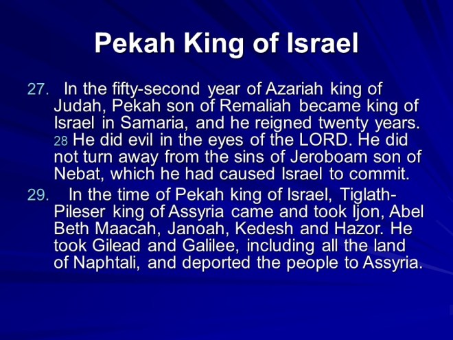2 Kings 15. The parade of Kings of Israel and Judah continues.  Azariah reigned in Judah, Zachariah reigned in Israel, Shallum reigned in Israel, Menahem reigned in Israel, Pekahiah reigned in Israel, Pekah reigned in Israel, Jotham reigned in Judah, all recorded in chronological order.