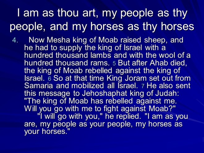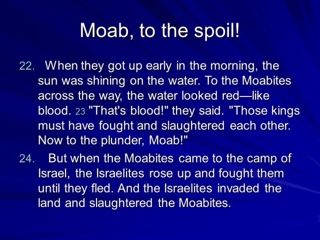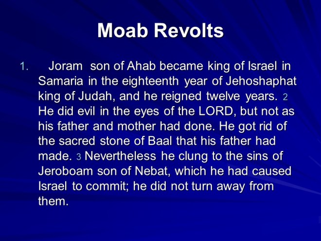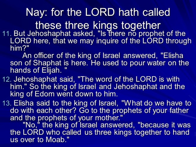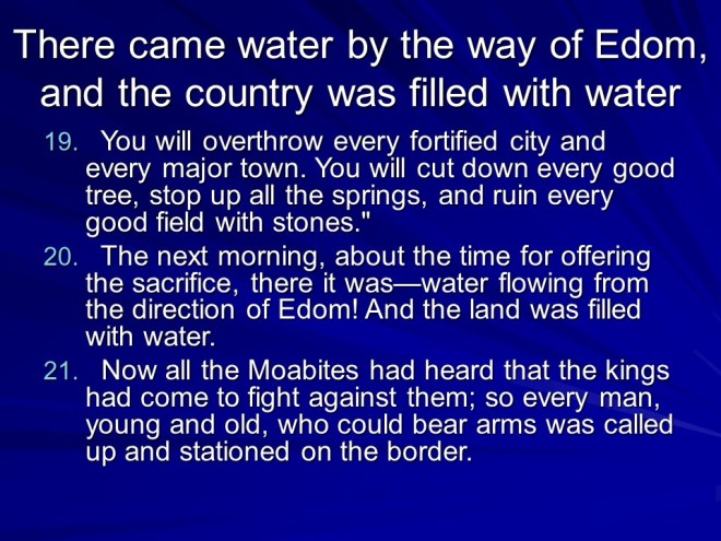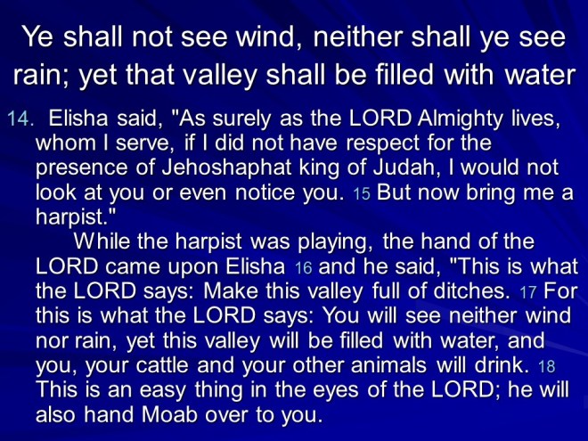 2 Kings 3. There was trouble all around: Moab Rebelled against Israel. Israel called for Judah and Edom to help. They gathered their armies and horses, but after seven days without water they called for Elisha. He told them to dig ditches in the desert. They obeyed, and without rain the ditches were filled, they all got water and quenched the rebellion. Then they punished Moab, but the King offered his firstborn son as a burnt offering. This was too drastic even for Israel, so they drew back.
